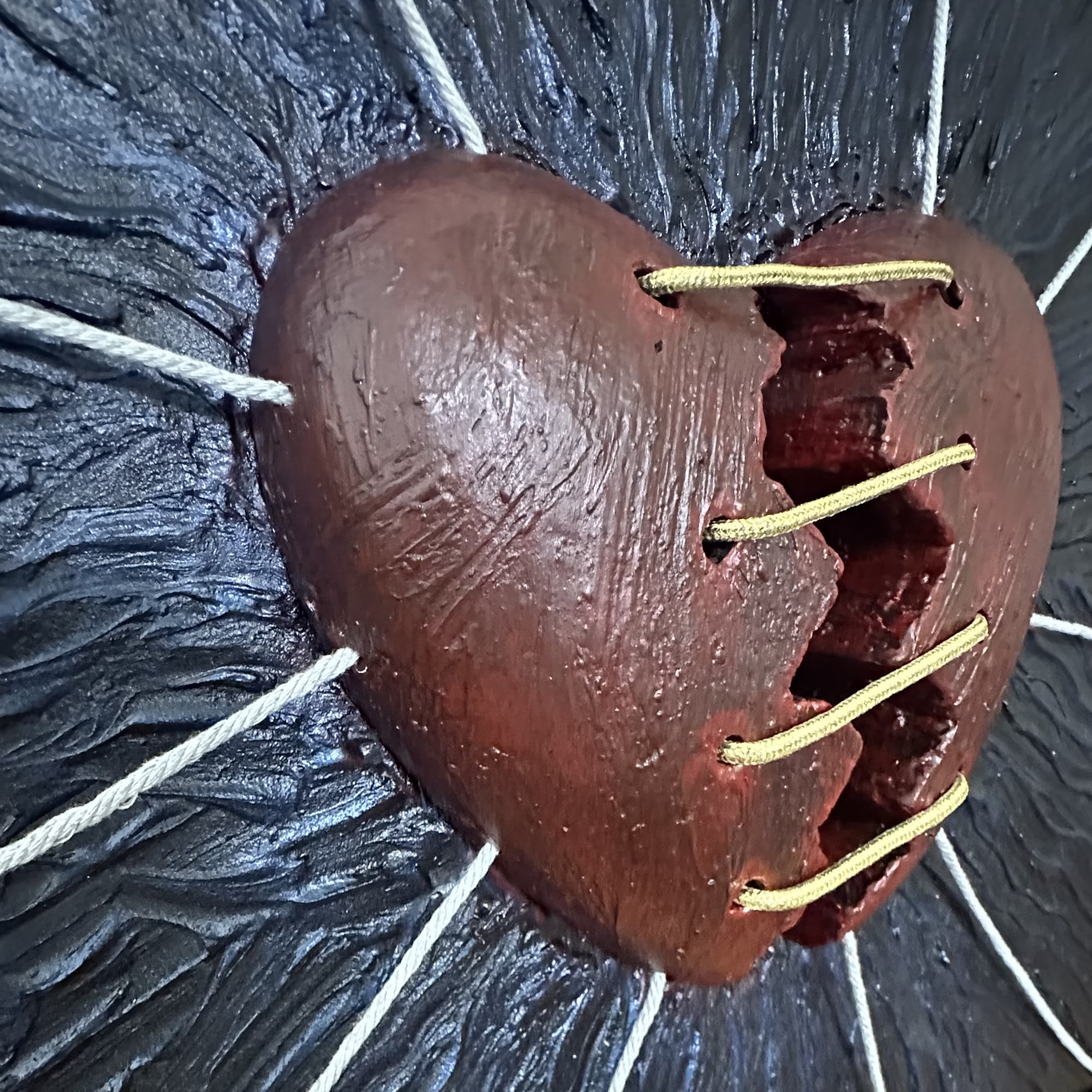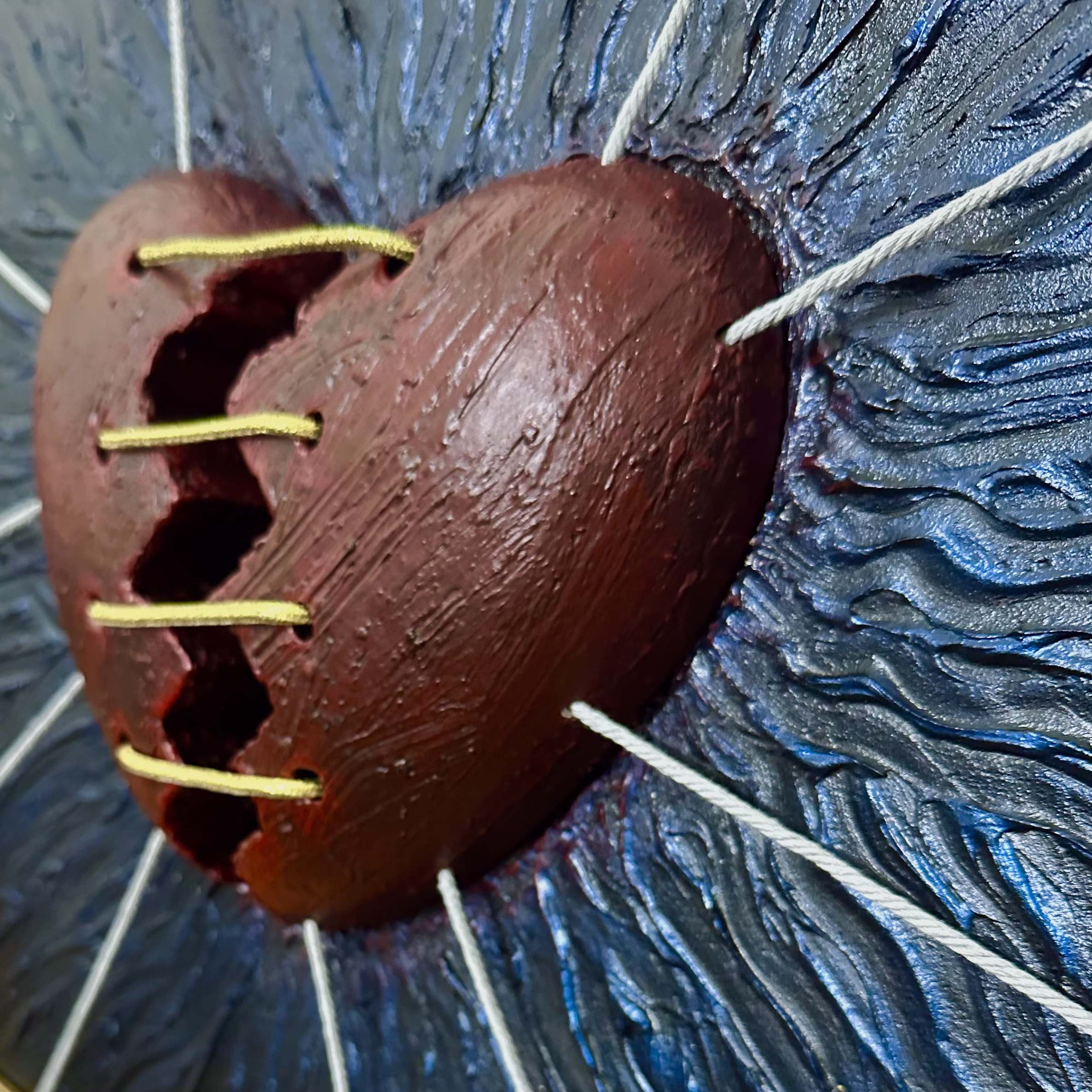 Mend is a one-of-a-kind work of art that delves into the emotional landscape of a heart under strain. The background’s dark, wavy blue texture symbolizes the turbulence of our deepest emotions, the storms that threaten to pull us apart. At the center, the heart is shown literally being tugged by strings in multiple directions, each string representing the various forces in life that pull on our heartstrings, be it relationships, societal expectations, or personal struggles. Yet amidst this tension, a single golden string holds the heart together, representing whatever it is that hold us, love, faith, hope or the inner strength that keeps us from completely falling apart. It is a visual meditation on how, even in our most fractured moments, something can still hold us together.