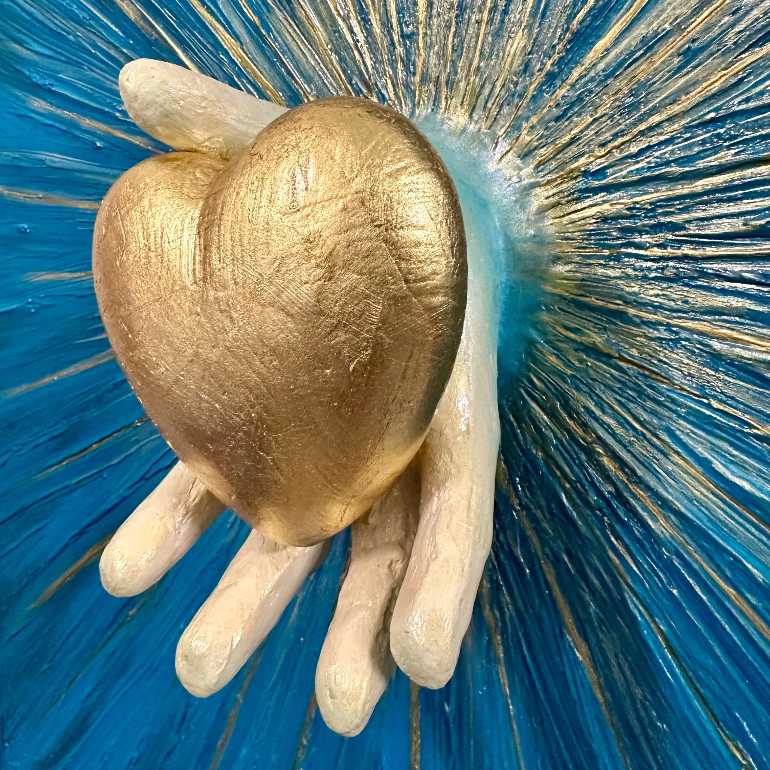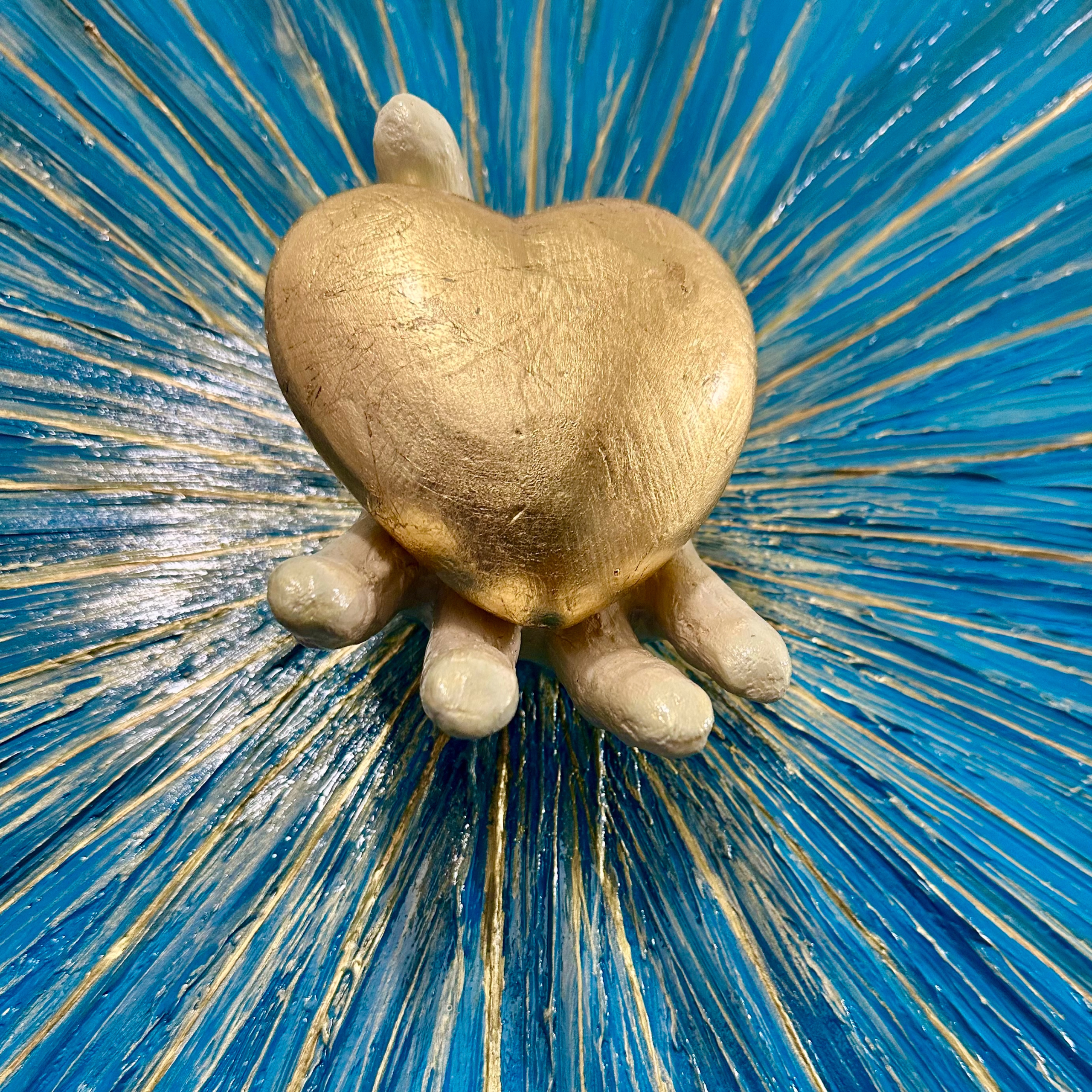 Present is a one-of-a-kind work of art radiating with rich texture and depth. In this piece, a 3D hand extends from a field of vibrant blues and shimmering gold foils. The hand holds a golden heart, symbolizing divine love in its most precious and pure form.  The rays of gold that emanate outward are not just decorative; they represent the sacred light of love that we both give and receive. The texture of the board, the rich acrylic layers, and the metallic accents all come together to create a dynamic sense of movement and sacredness. In Present, the gold heart is more than just a symbol. It is the embodiment of love offered freely, glowing with the warmth of grace. It reminds us to embrace the love that surrounds us and to recognize it as a sacred, guiding light in our lives. Every element of this piece, its 3D hand, the depth of the textures, and the interplay of blue and gold invites the viewer to pause and reflect on the present moment. It is a celebration of the pure, unconditional love that exists when we act with the best of intentions and an open heart