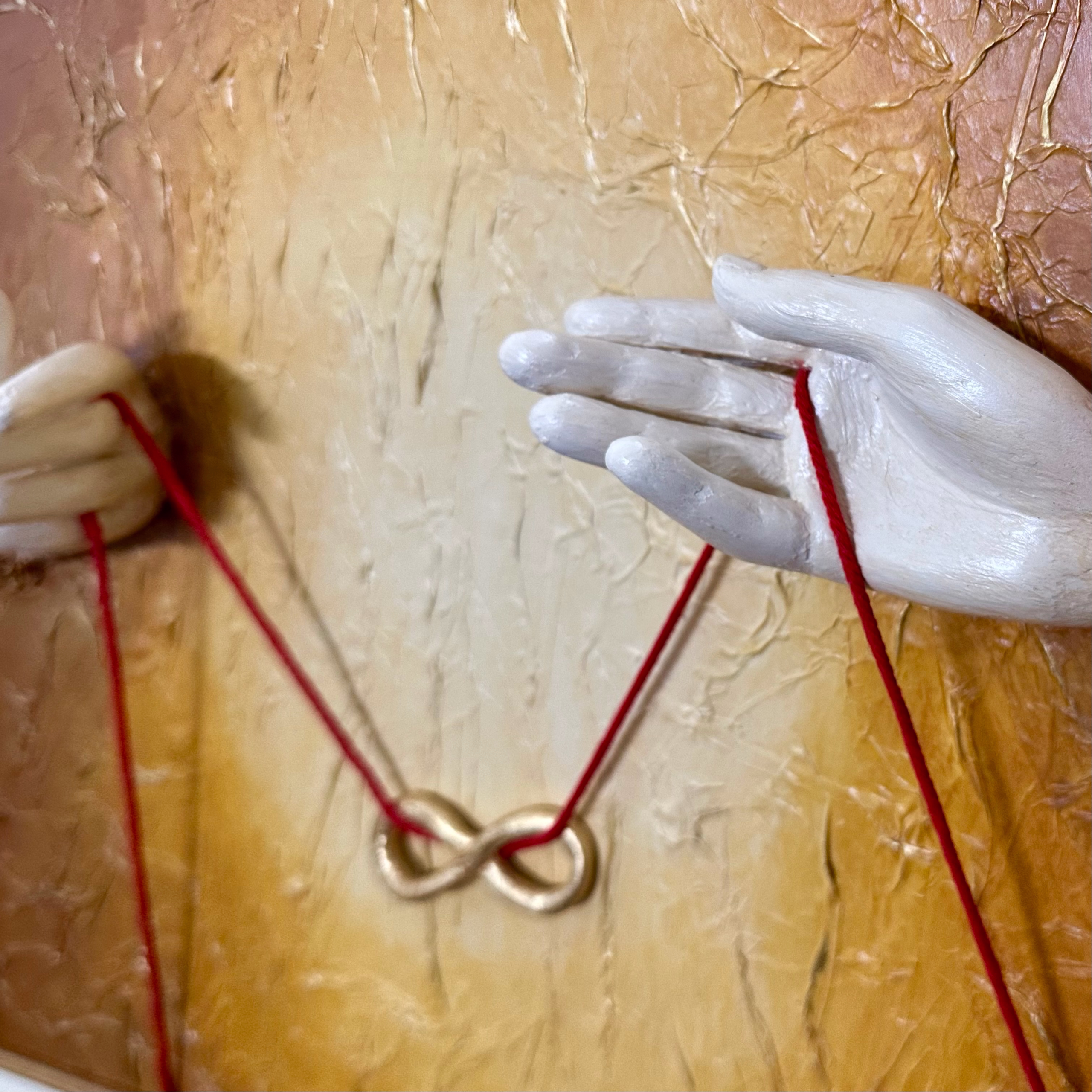 Ties is a one-of-a-kind work of art that delves into the intricate connections we share with others. Rich with texture and depth, this piece features two 3D hands, each holding a red string that loops into a golden infinity symbol at the center. This red string is a timeless symbol of the invisible yet unbreakable ties that bind us to significant people in our lives, those whose presence shapes, challenges and inspires our growth, leaving an enduring impact on our journey. The warm golden hues in the background evoke a sense of timelessness and the eternal nature of these connections. In Ties, the hands are positioned in a contemplative gesture, inviting us to reflect on the relationships that have left an indelible mark on our hearts. It’s a reminder that some ties are not merely happenstance they are eternal, meaningful, and essential to our growth and understanding. This piece encourages us to honor those connections and the lessons they bring.
